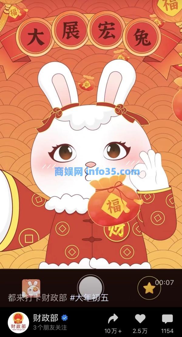 视频中,不但有动画萌兔在财政部门前的自拍,还有大展宏“兔”、前“兔”无量、“兔”然暴富等祝福语。